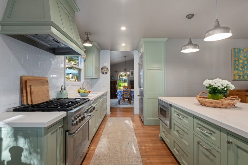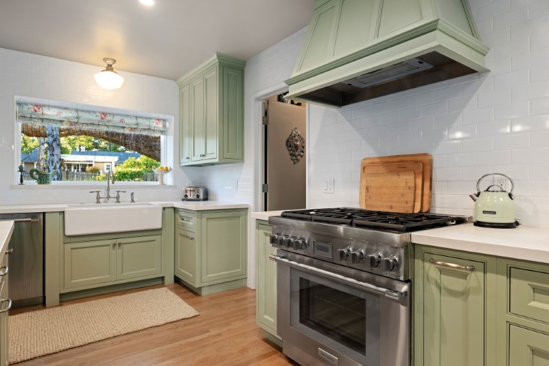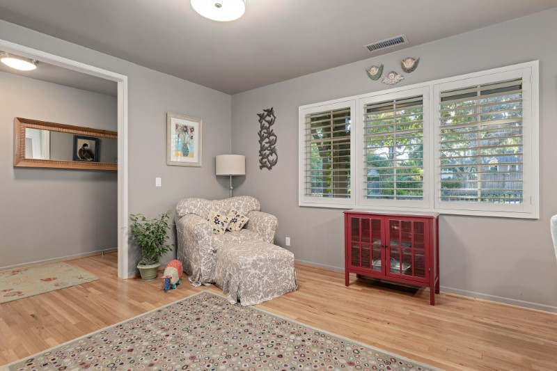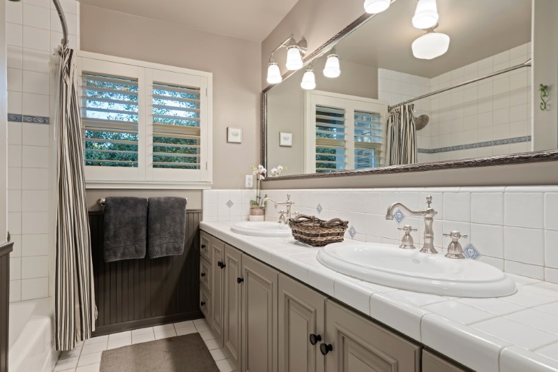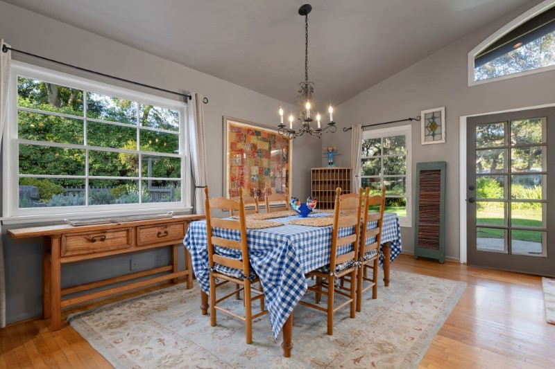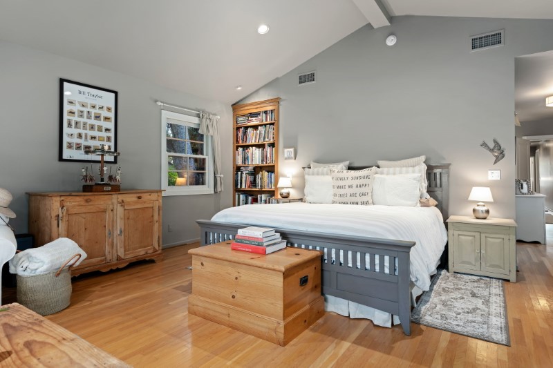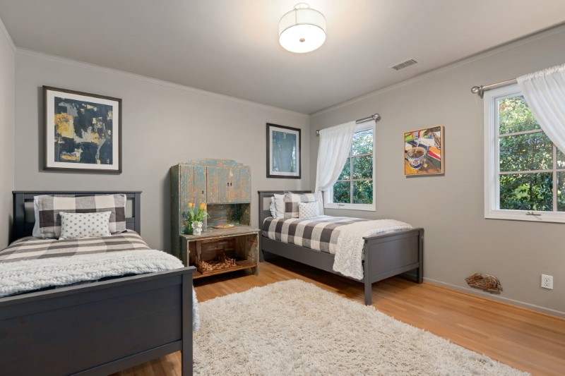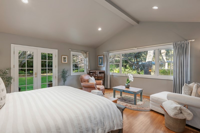 With its angled, vaulted ceiling, the living room and dining area is a spacious gathering place. French doors open to an expansive backyard where you may choose to dine outside and use the barbeque where the oaks trees sparkle under café lighting. The primary suite offers the sights and sounds of the creek, a generous walk-in closet, and French doors leading out to the backyard. There is a desk area for keeping life organized, and a California king-size bed outfitted in fine linens and tasteful bedding. Freshly updated with European simplicity, the en-suite master bathroom features double sinks, an oversized vanity, a large glass door shower, pine hutch with white tile and a white tile floor. The second bedroom room offers twin beds with stylish and comfortable down comforters and a large closet equipped with a double dresser. The third bedroom features a double size bed and looks out at the roses and stone wall bordering the front yard.